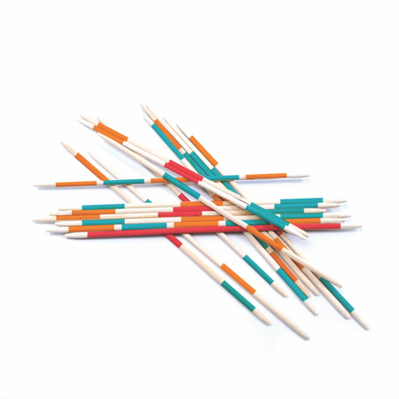 Zestaw zawiera 41 bierek w formie patyczków, które wykonano z drewna bambusowego, pomalowanego fragmentarycznie bezpiecznymi, nietoksycznymi farbami. Gra jest zamknięta w wygodnym, poręcznym pudełku, które pozwala bawić się tam, gdzie zechcecie.